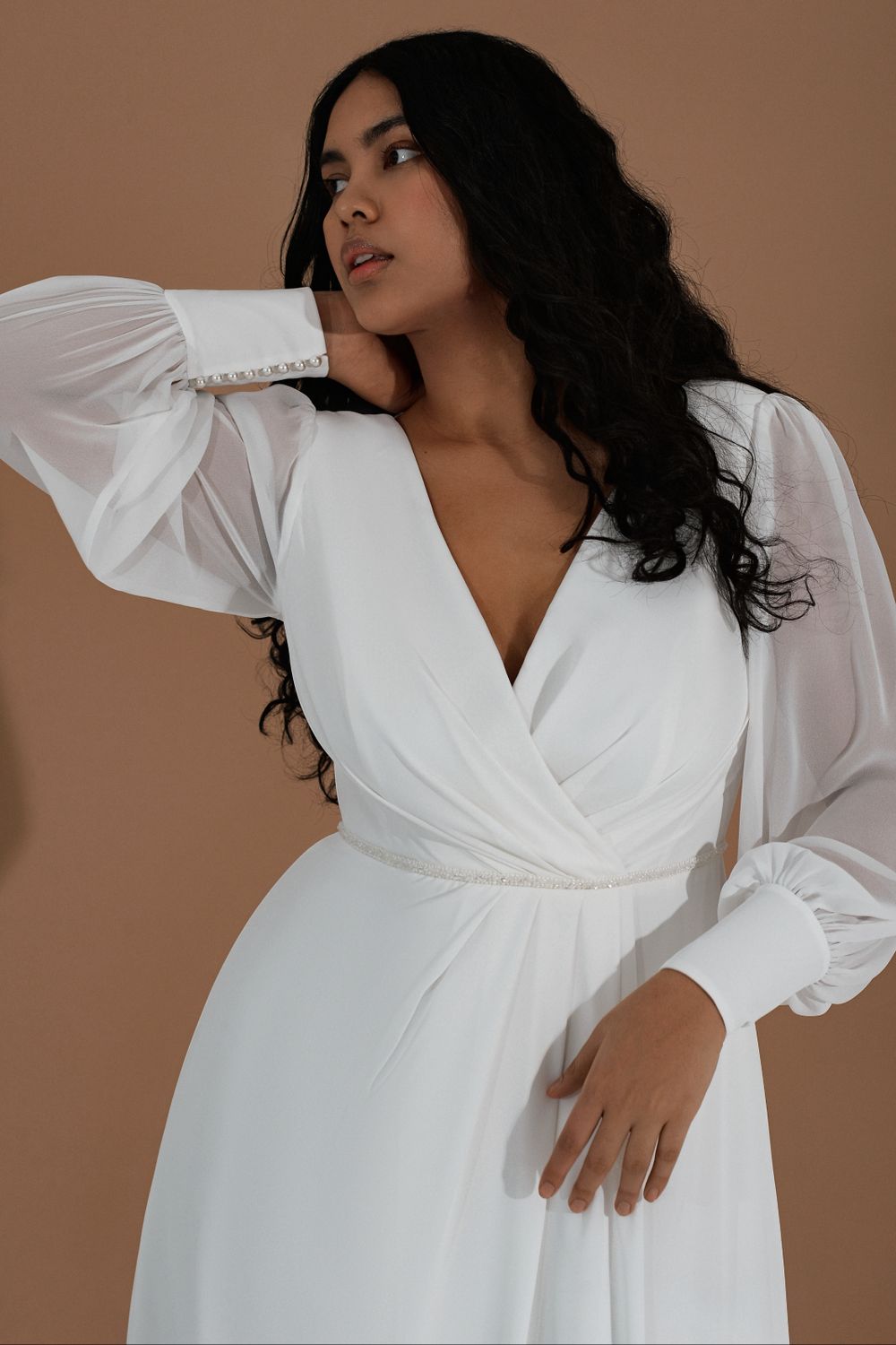 А-силуэт, Со шлейфом, Длинные, Минимализм, Лаконичные, Большие размеры, С вырезом на спинке, С длинным рукавом, С рукавами, С корсетом, V вырез, Креп