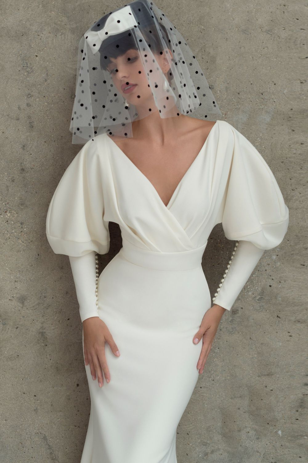 Со шлейфом, Рыбка, Длинные, Минимализм, Атласные, С вырезом на спинке, С длинным рукавом, Без корсета, Съемные рукава, V вырез