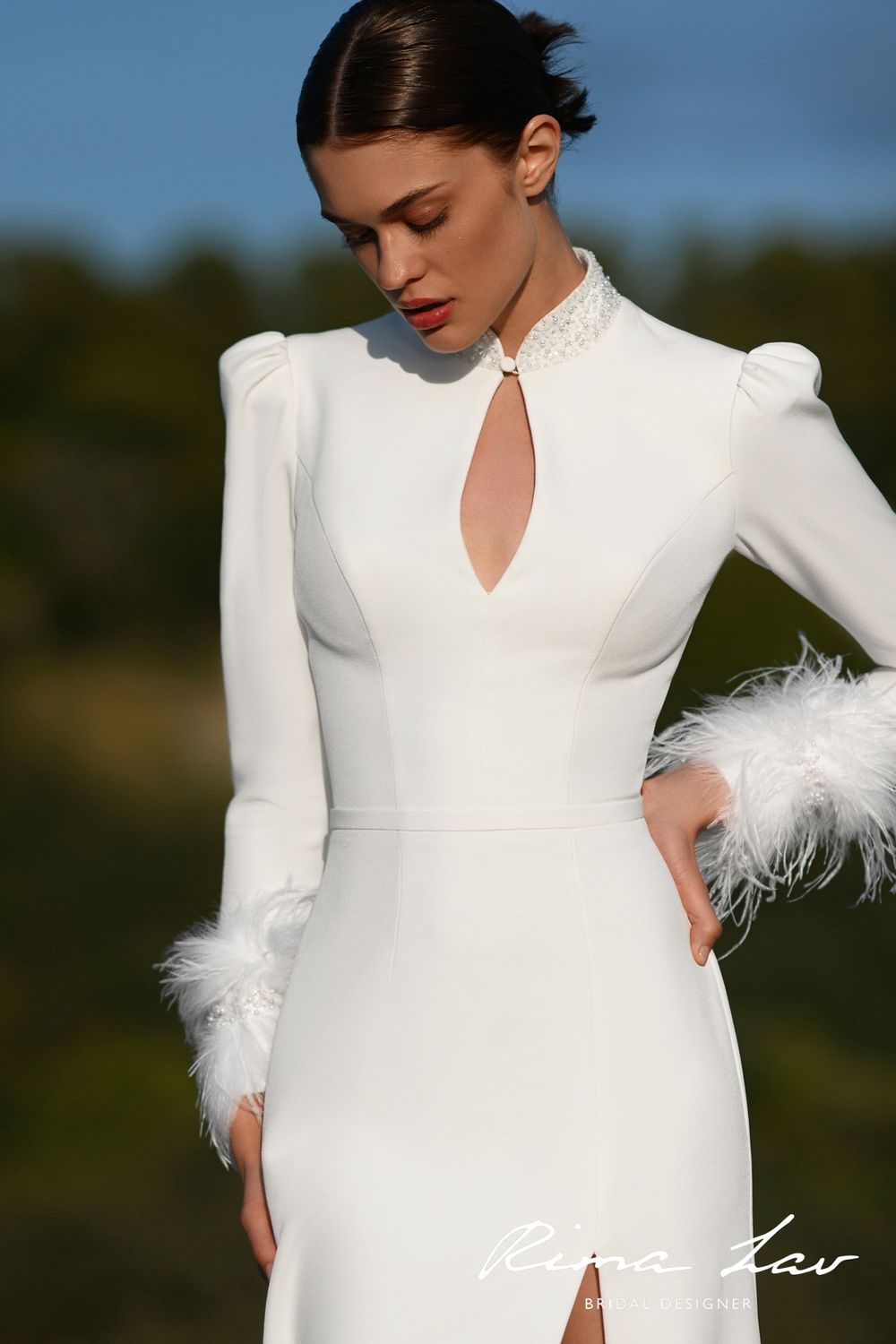 Со шлейфом, Прямые, Длинные, Лаконичные, Закрытый верх, С длинным рукавом, С рукавами, Без корсета, С разрезом на ноге, Креп